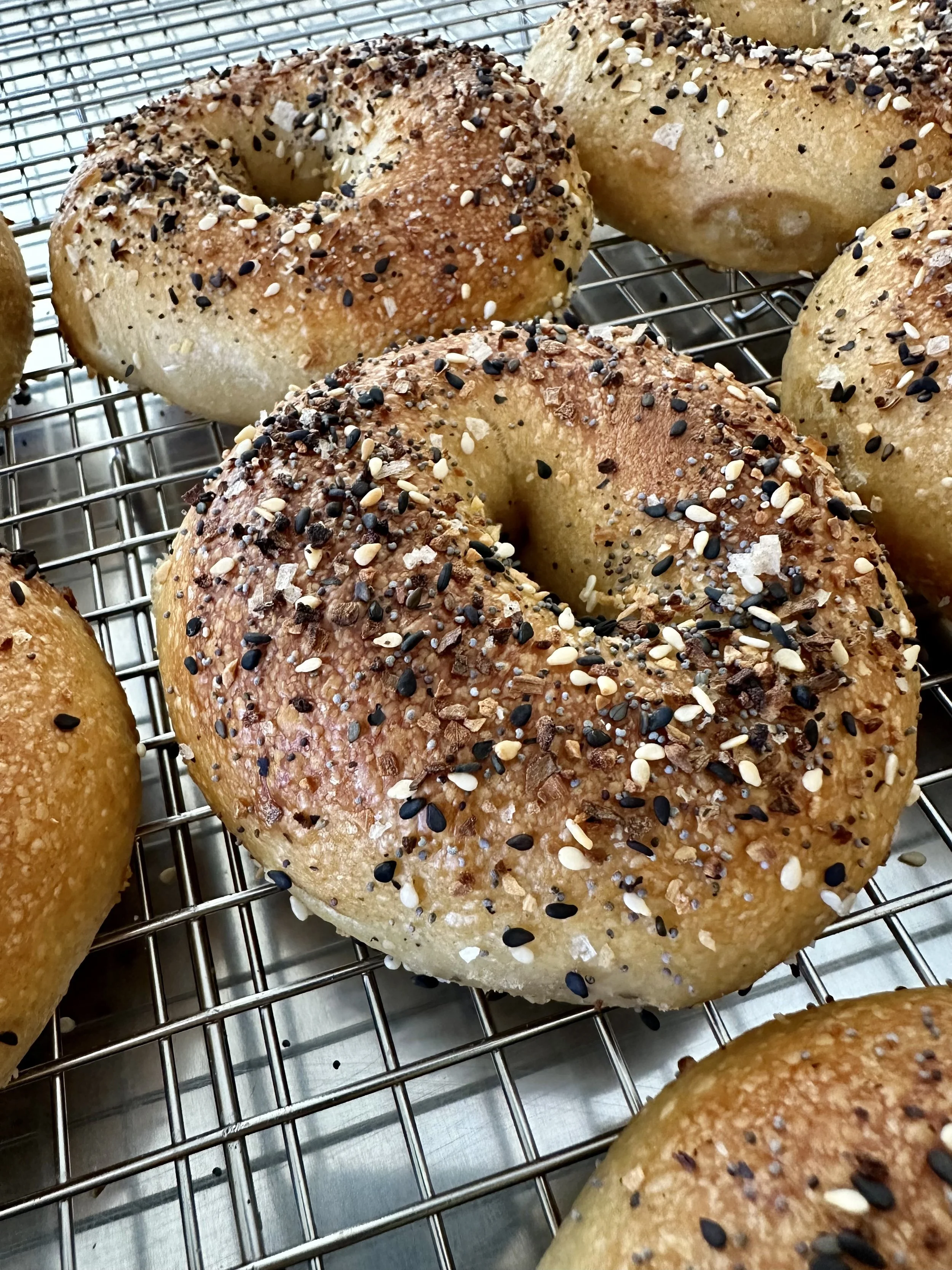 CHEF JOEL HAS BEEN MAKING SPECIAL SOURDOUGH BAGELS. IT’S a 30-HOUR PROCESS USING PREMIUM ORGANIC FLOURS AND HOUSE STARTER WITH RYE, WHOLE WHEAT, AND BREAD FLOUR AT 100% HYDRATION. HAND ROLLED, BOILED, AND BAKED FRESH.